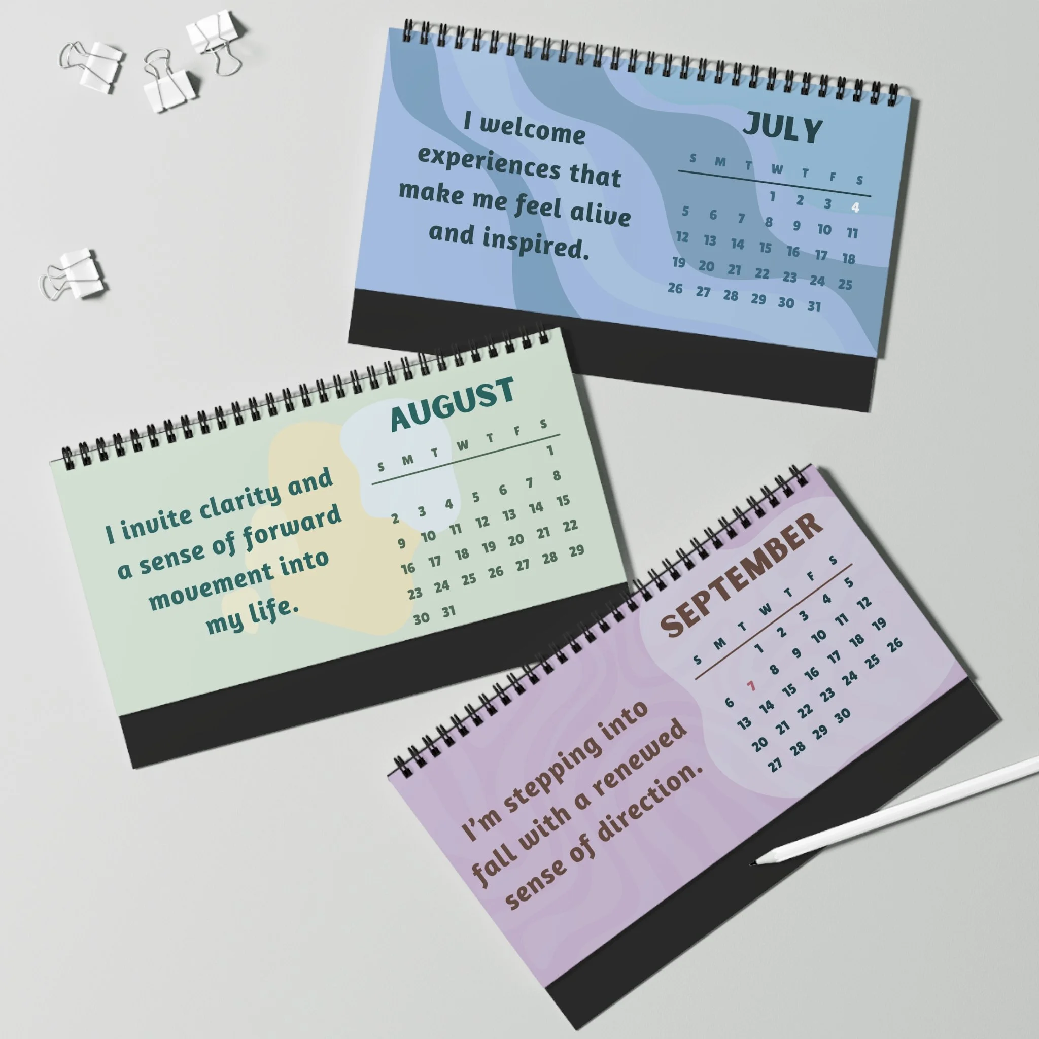 The Mindful Year is a thoughtfully designed 2026 affirmation desktop calendar featuring 12 original monthly layouts, soft color palettes, and grounding affirmations to help you stay centered all year long.